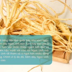 Sâm dây Ngọc Linh – Một loại sâm quý mọc chủ yếu ở khu vực Tây Nguyên Việt Nam. Sâm Dây Ngọc Linh được trồng hoàn toàn tự nhiên dưới tán rừng già ở độ cao 1.700m, nơi có điều kiện khí hậu và thổ nhưỡng đặc biệt trong lành. Chính sự hấp thụ Ƌinh khí của trời và Ƌưỡng chất của đất tại đây đã tạo nên những củ sâm thơm ngon và có vị ngọt đặc trưng.